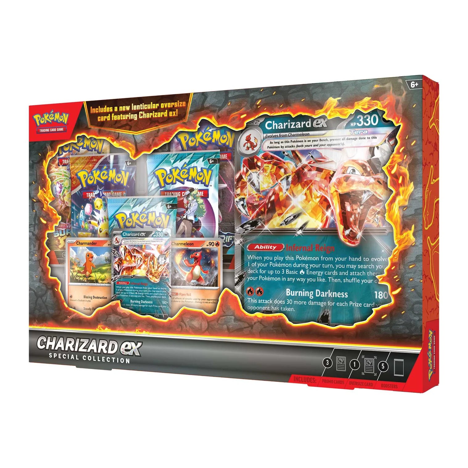 Charizard ex Brings the Darkness! Charizard ex burns up the opposition’s lead with the cunning firepower of a Darkness-type Pokémon! Evolve it from Charmander and Charmeleon, then use its strong Ability and attack to make a roaring comeback. This fiery set also comes with 5 Pokémon TCG booster packs and an oversize lenticular card featuring the Flame Pokémon itself—move the card back and forth to see Charizard ex go on the attack!